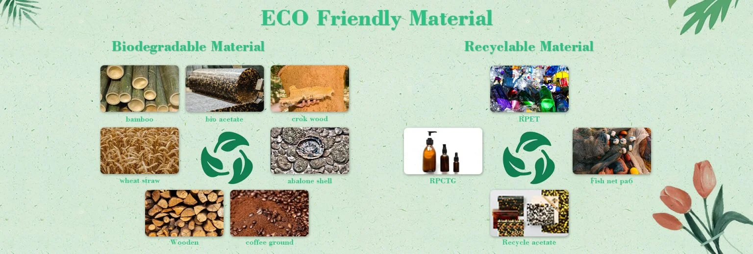Bio acetate, bamboo ,wooden, cork, wheat straw, coffee ground, and abalone shell.